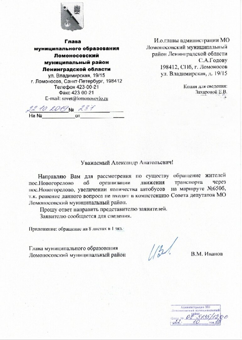 Получен первый промежуточный ответ от Главы Ломоносовского района Ленинградской области Иванова В.М. об увеличении количества автобусов №650б на маршруте.