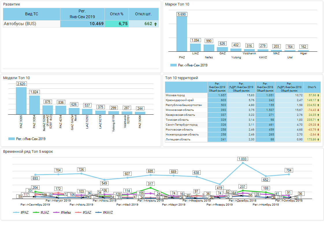 По данным «Автостат Инфо», за первые 9 месяцев 2019 года в России было продано 10 469 новых автобусов, из которых — 1107 иномарок. Доля иностранной техники в объеме всей продаж составила 10,6% в отчетный период, а годом ранее она была 9,4%. Рост продаж в сегменте автобусов иномарок за январь-сентябрь составил +20,5% — это заметно больше прироста, который показал за этот период весь автобусный рынок страны (+6,8%). Москва — главный рынок сбыта автомобилей марки Lada среди городов РФ Среди иномарок, представленных на рынке автобусов в России, лидирует марка Yutong. Китайский производитель продал в РФ за три квартала текущего года 402 ед. техники, что оказалось на 2,7% меньше, чем годом ранее — 413 ед. Higer реализовал в тот же период 162 автобуса, на 10,2% больше количества, проданного за тот же период 2018 года (147 ед.). Марка Simaz поставила российским покупателям 122 автобуса, что в разы превысило объем продаж за прошлый год — всего 6 машин. В то же время на 30% увеличились продажи