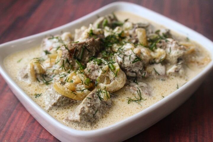 Говяжья печень - это очень вкусный и полезный продукт, из которого можно приготовить множество блюд. Сегодня мы будем готовить печень в сметане. Сначала мы немного обжарим печень на сильном огне, а потом будем тушить со сметаной под крышкой. Данный рецепт позволит разнообразить ежедневное меню вашей семьи вкусным и полезным продуктом. Ставьте лайк и подписывайтесь на канал «Fresh Recipes» в Яндекс Дзене, чтобы не пропускать наши новые публикации. А также присоединяйтесь к нам на нашем сайте fresh.ru, в соцсетях Фейсбук, Инстаграм и Youtube, где вы узнаете еще больше новых рецептов, кухонных лайфхаков, полезных советов и самых интересных новостей из мира еды Время приготовления: 40м. Ингредиенты Приготовление 1) На сковороде разогреть сливочное и растительное масло. 2) Лук нарезать полукольцами. 3) Выложить лук на сковороду. 4) Печень нарезать небольшими кусочками. 5) Лук обжарить до полуготовности. 6) Добавить печень. 7) Обжарить печень на сильном огне в течение 3-4 минут. 8) Добавить