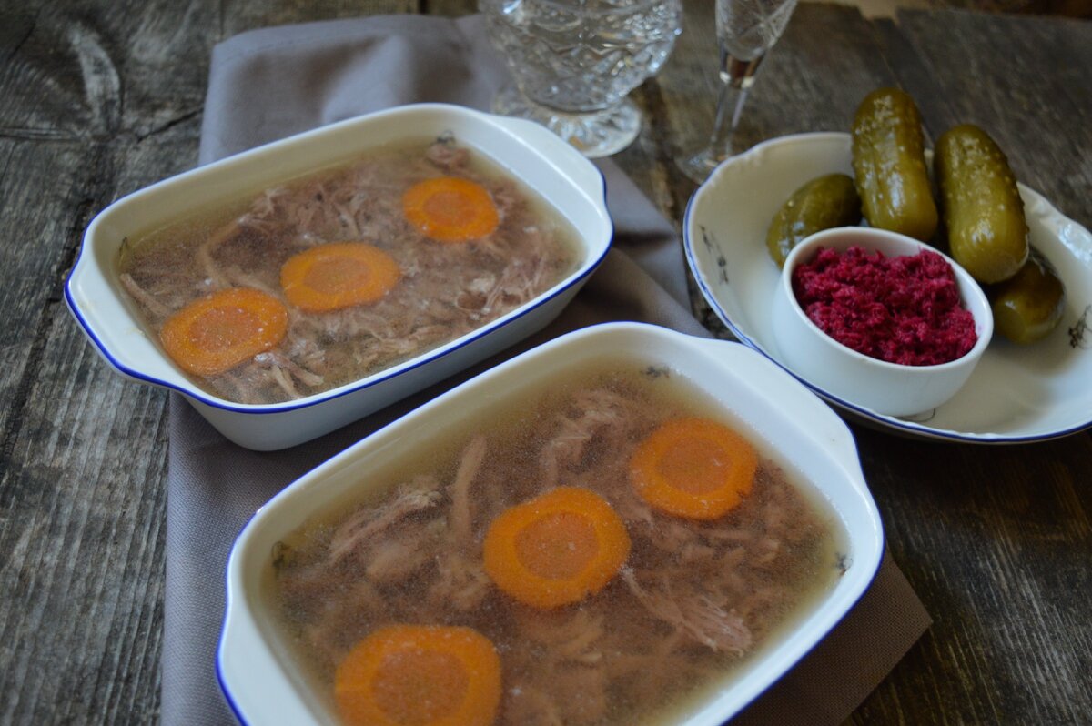У нас сегодня захолодало, начались заморозки. В такую погоду, с морозца, так хорошо за обедом порадовать себя и близких хорошим холодцом. В этот раз я решила сварить чисто говяжий вариант, хотя мой стандартный это свиные ножки и говядина пополам со свининой. Ну в этот раз было говяжье копытцо весом кило шестьсот. Из него и исходила по пропорции. Говядины я взяла килограмм триста грамм. Говядина эта была мясными обрезками с грудинки и куском бульонки без кости. Воды налила два с половиной литра. После закипания тщательно сняла пену. Чем лучше снята пена, тем прозрачнее будет холодец. Мясо посолила, соли должно быть достаточно, добавила одну морковку, луковицу прямо в чешуе, по семь горошен черного и душистого перца, две гвоздички. Далее оставляем чуть-чуть кипеть семь часов. Оставила на ночь, укутав, в теплом месте. Перед тем, как выключить холодец, я всегда наливаю черпак в пиалу, остужаю и ставлю в холодильник. Через два часа я уже знаю, застынет ли завтра холодец. Если пиала не