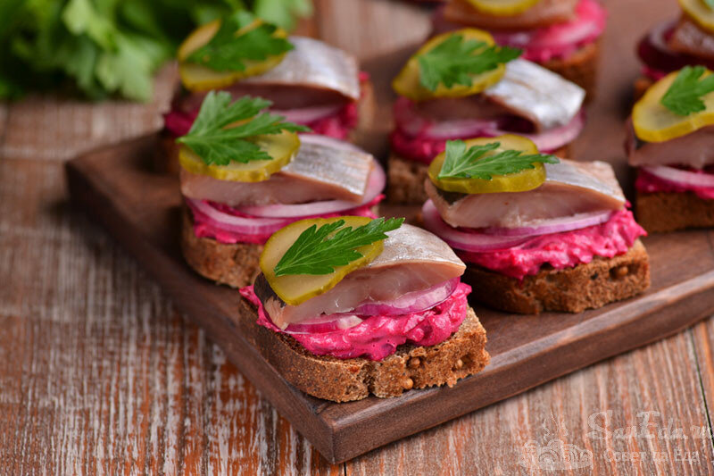 Потрясающе вкусные и красивые закусочные бутерброды с селёдкой и свёклой. Остроту закуске добавляет репчатый лук, пикантный вкус солёный огурец. Чтобы основа из свёклы стала сочной, дополняю её майонезом. Из простых ингредиентов получаются ароматные и яркие мини-бутерброды, которые станут украшением праздничного стола. Порции 12 шт. Время подготовки 50 минут Время приготовления 10 минут Ингредиенты Инструкции 1. Свёклу промываем с губкой и варим в воде 40-45 минут. На готовность проверяем ножом. Охлаждаем и очищаем. 2. Такие бутерброды можно приготовить за 10 минут, если купить готовое филе рыбы и варёную свёклу. Я использую целую сельдь, которую разделываю на филе, пока варится свекла. Отрезаем хвостовой плавник, голову, затем разрезаем брюшко, все внутри удаляем и промываем. Поддеваем пальцами кожу и снимаем её с тушки. От основания головы разделяем пальцами сельдь на 2 части и убираем все косточки. 3. У меня в рыбе была икра, я тоже её использовала для бутербр