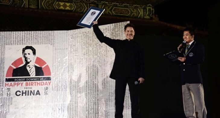 Открытка для Роберта Дауни — младшего Роберт Дауни — младший имеет огромные толпы фанатов по всему миру. И Китай не является исключением. Китайские поклонники подарили «Железному человеку» открытку. Но не простую. Ее подписали 5 339 человек!