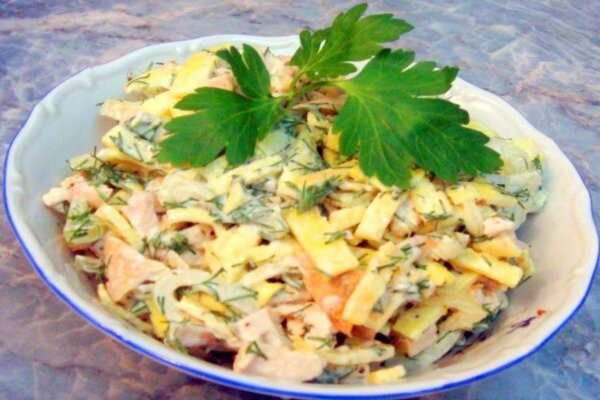 Для приготовления на два закопченных окорока двести граммов белой капусты, два лука, морковка, немного чеснока, майонезный соус, соль. Для приготовления омлета три яйца, три большие ложечки майонезного соуса, маленькая ложечка крахмала, масло из подсолнухов, черный размолотый перчик, соль. Взбейте яйца с майонезным соусом, крахмалом, размолотым перцем и солью. Залейте в промазанную маслом из подсолнухов сковородку, закройте крышкой и поджарьте омлет. После охладите омлет и разрежьте его соломинкой. Разрежьте, намело капусту, присолите и слегка перетрите руками. Разрежьте лук на кубики, морковку протрите на большой терке, поджарьте вместе на масле из подсолнухов. Мясо из кур отсоедините от костей, разрежьте на кубики. Намело, разрубите чеснок. Салат разложите слоями, промазывая их майонезным соусом, первый слой мясо кур, присыпаем чесноком, второй омлет, чеснок, третий капуста, четвертый морковка с луком. Дальше повторите все слои полив майонезным соусом и дайте настояться.