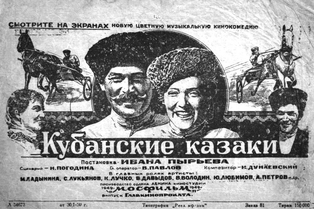 "Кубанские казаки" - советская музыкальная комедия, снятая в 1949 году режиссером Иваном Пырьевым по сценарию Николая Погодина. Премьера фильма состоялась 26 февраля 1950 года. Иван Пырьев хотел снять яркую историю, которая дарила бы зрителям радость и оптимизм. Он начал собирать информацию о богатых городских ярмарках. Все было не то, пока он не узнал о журналисте и драматурге Николае Погодине, который написал пьесу о жизни казаков на Кубани. Режиссер обратился к Погодину с просьбой написать сценарий фильма под рабочим названием "Колхозная ярмарка", который позже стал называться "Веселая ярмарка". На роль Галины Пересветовой сразу была утверждена Марина Ладынина - жена режиссера Пырьева, а вот "казака лихого, орла степного" Гордея Воронова искали долго. Ладынина порекомендовала посмотреть актера театра и кино им. Вахтангова Сергея Лукьянова, но режиссер его пробы забраковал. Выяснилось, что Лукьянов пробовался без грима и костюма. Его загримировали, сделали фотографии и показали их Пы