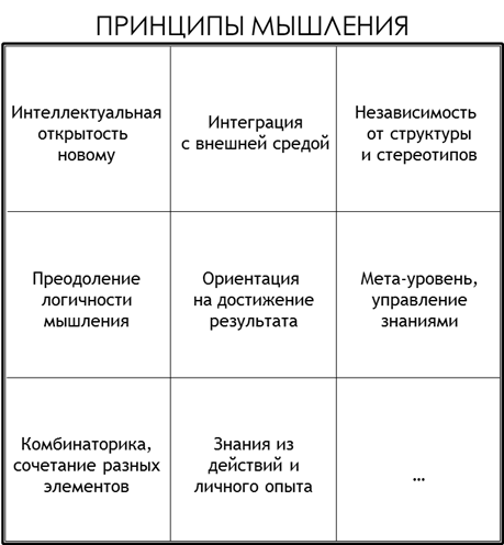 Принципы - это то, что отделяет профессионалов от любителей. У любителей нет принципов, они делают то, что им нравится. Профессионалы себя ограничивают и одним из таких ограничений являются ПРИНЦИПЫ. Я не претендую на системность изложения, скорее это над-системная вещь, импровизация, которая переходит в ланшафт. Воспользуемся матричным методом, чтобы изложить принципы Гипермышления: Во-первых, это интеллектуальная открытость, то есть ваша готовность воспринимать и познавать новое. Во-вторых, интеграция с внешней средой, что подразумевает быть в контексте условий и не терять связи с ситуацией. Третье, это независимость от структуры, а точнее — от связей между элементами, убеждениями, которые могут ограничивать гипотезы и круг действий. Четвертое - выход за одномерность логики, это помогает избежать оценочных рассуждений в стиле «холодно или жарко» и создавать то, что раньше казалось невозможным. В пятых - ориентация на результат, когда достижения, продвижение к цели и сами цели явл