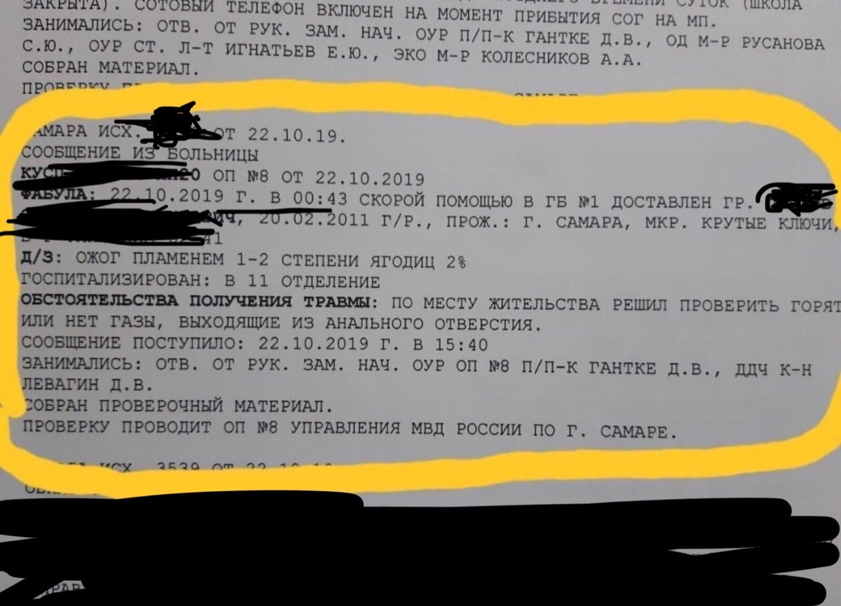 Подросток получил ожоги после эксперимента с собственным организмом. В Самарской области правоохранители проводят проверку после ЧП со школьником, которого госпитализировали с ожогом ягодиц. Восьмилетний ребенок из крутых Ключей решил провести эксперимент с собственным организмом и выяснить, горят ли его газы. Мальчик поднес зажигалку к ягодицам и пукнул. Опыт закончился для экспериментатора ожогами ягодиц 1-2 степени. Известно, что в настоящее время по факту инцидента правоохранители проводят проверку.