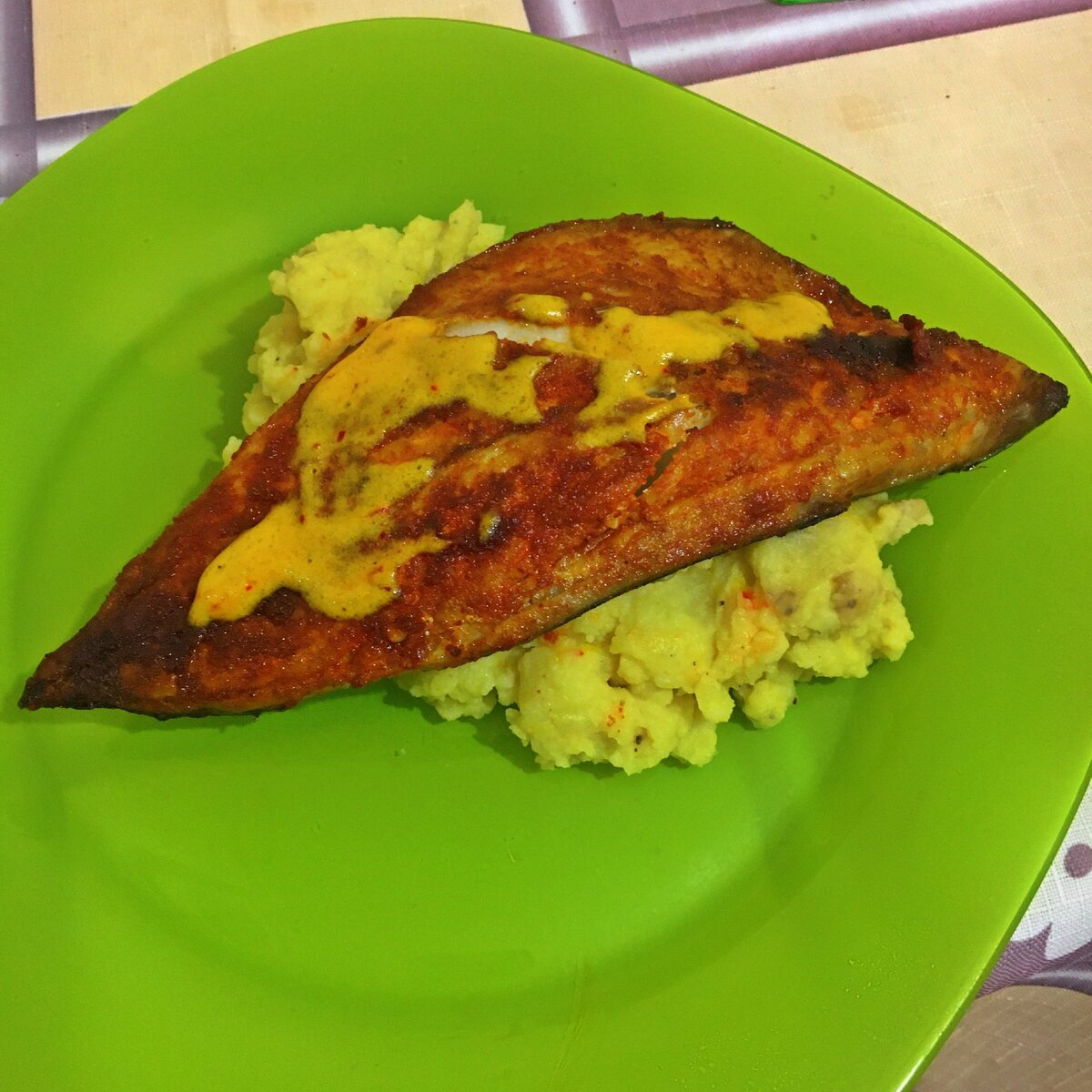 На тарелку выкладываем пюре, сверху рыбу и можно полить остатками соуса. Но красиво сделать это, у меня не вышло. Простите!