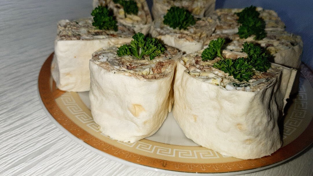 сардину, сайру, тунец, скумбрию, горбушу или лосось. Рыбу достаем из масла, удаляем косточки и разминаем вилкой 2 сваренные вкрутую яйца натираем на крупной терке лаваш смазываем сметаной с чесноком и зеленью,лаваш у меня 28х56 см сверху выкладываем рыбные консервы равномерно распределяем тертые яйца, сверху посыпаем тертым сыром аккуратно сворачиваем заготовку в рулетик