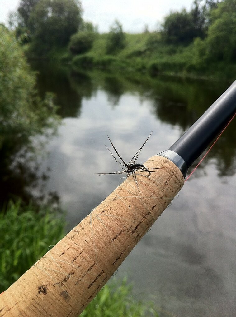 Прогноз на выходные убедил оставить вейдерсы дома. Потому на даче я был налегке – болотники, 1 коробка с мухами, пара шнуров и несколько разных удочек для тенкары от 315 до 390 см. В воскресенье распогодилось и я решил все же заскочить на речку, хотя было ясно, что при высоком уровне там в болотниках ловить можно только с берега. Так и оказалось. Что ж – попробуем. Собрал самый длинный ZEN13 (390 см) и полез в траву, которая вымахала до подбородка. Аккуратно подкрался к берегу и начал облавливать высокую, помутневшую воду.. Плеснула рыба, потом еще одна. Значит шансы есть )