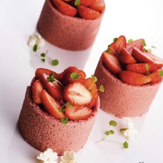 Рецепт: На 6-8 пирожных Крем шантийи с ванилью: Сливки 35% (1) – 120 г. Ванильные стручки – 2 шт. Желатиновая масса – 9 г. Сахарный песок – 40 г. Маскарпоне – 70 г. Сливки 35%(2) - 240 г. Ванильные стручки разрезать вдоль и вычистить семена в кастрюлю, поместить туда же и сам стручок. Добавить к ним сливки (1), довести до кипения и дать настояться в течение нескольких часов, а лучше ночь. Процедить массу и вновь слегка нагреть ее, добавить желатиновую массу и тщательно перемешать. Вылить массу на маскарпоне, перемешанный с сахаром, и добавить сливки (2). Пробить массу погружным блендером и поместить в холодильник как минимум на 6 часов. Клубнично-ванильное конфи: Клубничное пюре – 390 г. Сахарный песок – 32 г. Пектин NH – 8 г. Лимонный сок – 6 г. Ванильные стручки – 2 шт. Ванильные стручки разрезать вдоль и вычистить семена в кастрюлю. Добавить к ним же и сами стручки, а также пюре и нагреть их до 60-70°. Достать стручок ванили и ввести "дождем", постоянно помеши