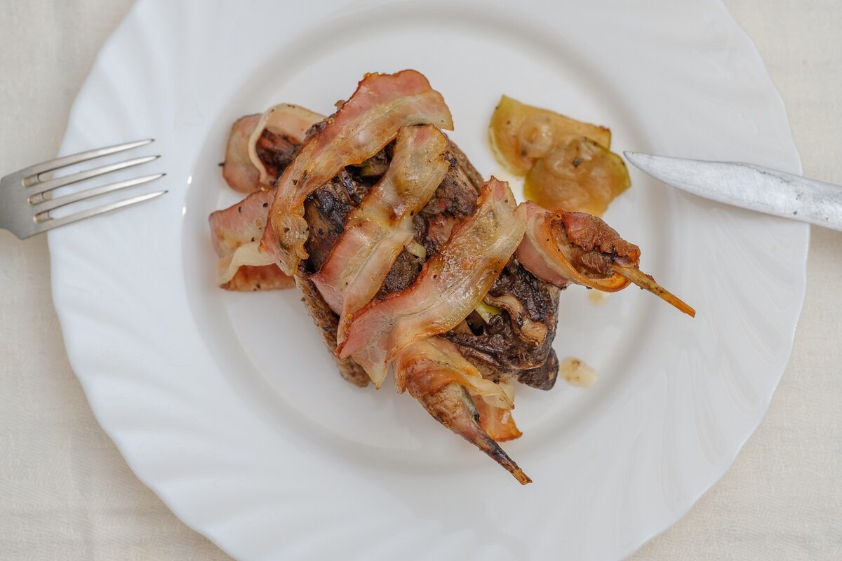У охотников с давних времен есть понятие «красная дичь». Из пернатой дичи к ней относятся вальдшнеп, бекас, дупель, гаршнеп и некоторе другие птицы. За их наиболее ценные качества, с гастрономической точки зрения. На красную дичь было принято охотиться знати, а на глухарей, тетеревов и всяких там уток - простолюдины. Мне, как уважаемому господину, от друзей охотников достался вальдшнеп. )) Это небольшая птичка с длинным клювом, по размеру примерно как перепелка. Осенний вальдшнеп перед отлетом он сильно жиреет. Если весенняя птица весит около 250–300 грамм, то осенняя – от 350 до 480 грамм. Мясо этой красивой птички обладает своеобразным ореховым вкусом. Есть масса разных способов приготовления вальдшнепа. Это и супы, и мясо в горшочках с различными специями и пряностями, и тушеный вальдшнеп с черносливом, и т.д. Я решил приготовить тушку в духовке, начиненную зеленым яблоком с травами. И завернуть тушку в бекон для сочности. Зеленое яблоко, лук, немного тимьяна и розмарина, соль, пер