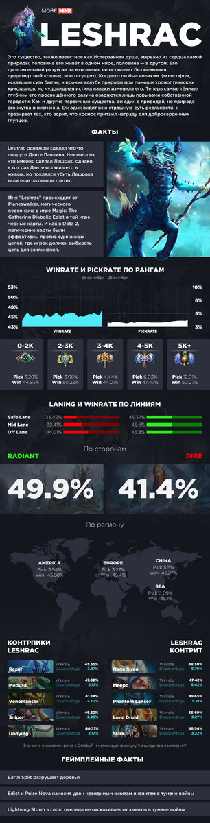 Лешрак - классический пример героя, подходящего под определение "стеклянной пушки" (glass cannon). Термин означает что он способен нанести тонны урона всего за несколько секунд, однако, героя очень легко убить, и для того чтобы быть полезным ему требуется держать практически идеальную позицию в драках и на карте. Лешрака довольно легко законтрить, поэтому важно понимать, когда можно пикать этого героя, как именно на нем играть, и когда герой достигает максимального импакта на карте. Наша инфографика отвечает на эти, и многие другие вопросы о Лешраке, и представляет развернутую статистику, контрпики, а также геймплейные и лорные факты! Лешрак - один из самых могущественных магов во всей Доте, способный сжечь дотла всех врагов вокруг себя буквально за считанные секунды. Герой явно не заслужил тех нерфов, которые получил несколько патчей назад, но при этом эти нерфы не так сильно ослабили персонажа, как может показаться на первый взгляд. Он по-прежнему опасен и способен выдавать колос