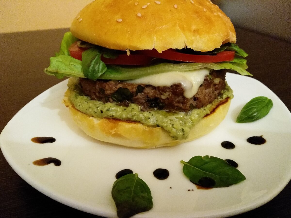 Бургеры со специальным соусом песто с артишоками, моцареллой и салатом романо. На 3 бургера 3 булочки для бургеров с кунжутом Котлеты 450 говяжьего фарша 80%20% 2 ст.л. красного вина 0,75 ч.л. соли 0,75 ч.л. черного перца 1,5 зубчика чеснока 1/2 пучка базилика (только листья) Соус песто с артишоками Соус песто (рецепт здесь) 75 гр. маринованных артишоков 4 ст.л. майонеза Бальзамический соус 150 мл. бальзамического уксуса 175 гр. твердой моцареллы 1 крупный помидор салат романо базилик (листья) Начинаем с соуса. Здесь все просто. В блендере смешиваем соус песто, артишоки и майонез. Убираем в холодильник. Бальзамический соус В сотейнике, бальзамический уксус доводим до кипения, уменьшаем огонь и варим 10-15 минут, пока не увариться до густоты, приблизительно 3 ст.л. Котлеты Говяжий фарш смешиваем с красным вином, мелко нарезанным чесноком, мелко нарубленным базиликом, солью и черным перцем. Формируем котлеты. Помидоры режем кольцами. Моцареллу нарезаем. Булочки разрезаем, жарим.