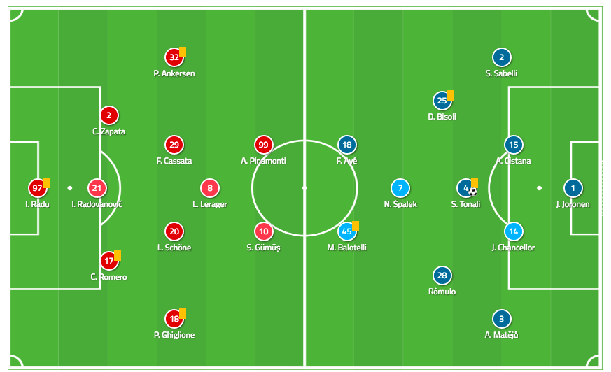 Дженоа и Брешия довольно неудачно начали чемпионат, и если Брешии изначально никто не предрекал высоких позиций, то вот настолько неудачная работа Андреаццолли у руля "грифонов" для многих стала откровением. Как бы там ни было, генуэзскую команду принял Тиаго Мотта, который сходу внес несколько изменений в тактику и состав команды. Стартовые составы Главной интригой матча было то, как на практике должны выглядеть хваленые 2-7-2 Тиаго Мотты. Ответ оказался достаточно ожидаемым - схему 2-7-2, разумеется, стоит рассматривать горизонтально. Где первые и последние двойки - это вингеры и крайние защитники на каждом из флангов соответственно, а 7 - центральная ось, включая голкипера. Говоря обычным языком, 2-7-2 - это те же 4-3-3. Правда начал Мотта матч со схемой 3-4-1-2, с Лерагером играющим под Пинамонти и Гюмюшем. Прессинг Дженоа Дженоа довольно активно прессинговал гостей в начале встречи, используя персональный прессинг и стараясь перекрыть все возможные адресаты, чтобы вынудить Брешию