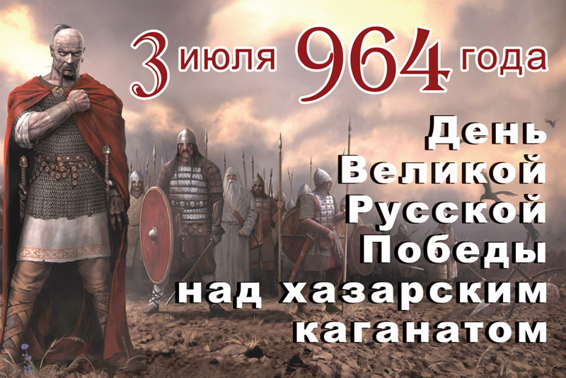 Пока мы, русские, живы, мы должны помнить и славить Великие Победы наших предков. 3 июля 965 года дружина князя русов Святослава одержала убедительную победу над войском Хазарского каганата, порабощённого иудеями и превращённого в гнездо паразитизма на планете.Святослав, князь киевский, — сын Игоря и Ольги, в значительной мере правившей при сыне государством (до ее смерти в 969 году), поскольку князь все время проводил в военных походах. В 964—66 годах (в 22 года) Святослав предпринял первый самостоятельный крупный поход: освобождение вятичей от власти хазар и подчинение их Киеву.