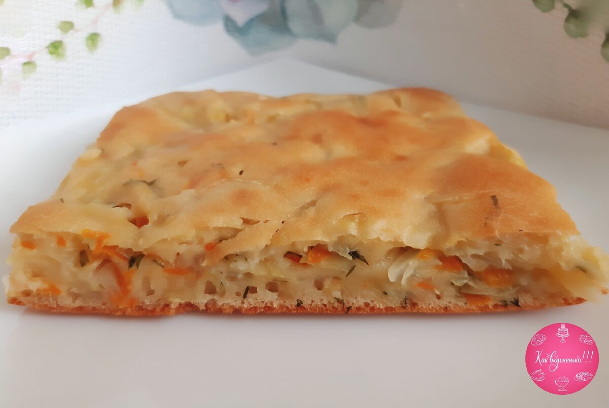 Сегодня я хочу поделится с вами отличным вариантом не сладкой выпечки. Пирог с капустой получается нежным и вкусным, просто тает во рту! Рецепт простой без заморочек! Ингредиенты : - яйцо крупное - 2 шт. - кефир - 250 мл. - мука - 200 гр. - соль - 1/2 ч.л - сода - 1/2 ч.л. Начинка: - капуста - 300 гр. - морковь - 1 шт. - укроп - 1 маленький пучок - соль - 1/2 ч.л. - любовь - в неограниченном количестве ❤ ❤ ❤ Прямоугольная форма для выпечки 22*24 см 1. В кефир добавляем соду и отставляем в сторонку. А пока займёмся начинкой. 2. Шинкуем капусту, морковь трём на тёрке. Смешиваем и солим. 3. Тушим на сковороде с добавлением воды без масла, 12 минут. В конце добавляем мелко порубленный укроп. 4. В глубокой миске яйца взбалтываем с солью. 5. В яичную массу добавляем кефир и муку. 6. Всё тщательно перемешиваем. Тесто по консистенции получается