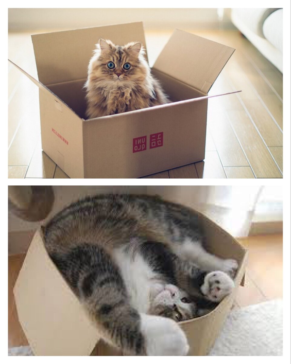 Почему коты любят коробки? 📦🐾 Так почему же первым делом, как только в доме появляется коробка, большая, маленькая, а иногда совершенно несоразмерная масштабу котейки, кот непременно пытается в неё упаковаться? Кроме того, что для маленьких хищников, к отряду которых классификация относит кошек, коробка является отличным укрытием и местом для засады, существует ещё два убедительных аргумента. Кошки комфортно чувствуют себя в тепле, когда температура воздуха примерно равна температуре их тела. И создать такой микроклимат в коробке котам гораздо проще. И это физиологический фактор. Второй будет психологическим. Так как кошки не имеют механизма разрешения конфликтов - то их логичной реакцией на стресс является его избегание. Коробка в этом сильно помогает, а также раковина, уютное место в шкафу или на нём. Полезный факт! Если вы принесли котёнка домой, то предоставьте ему коробку, не очень большую. Исследования нидерландских учёных показали, что при наличии коробки коты быстрее ада