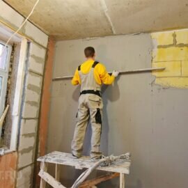 Очень важно все инструменты хорошо промывать и очищать после завершения каждого нового этапа работ. Если штукатурка наносится в несколько слоев, то нужно дождаться высыхания предыдущего слоя перед нанесением последующих. Проверить степень готовности просто: слегка надавить пальцем, и если поверхность не крошится и не проминается, то можно смело наносить следующий слой. Если нужно оштукатурить стены в помещении, то лучше начинать с потолка, а уже потом переходить к самим стенам.