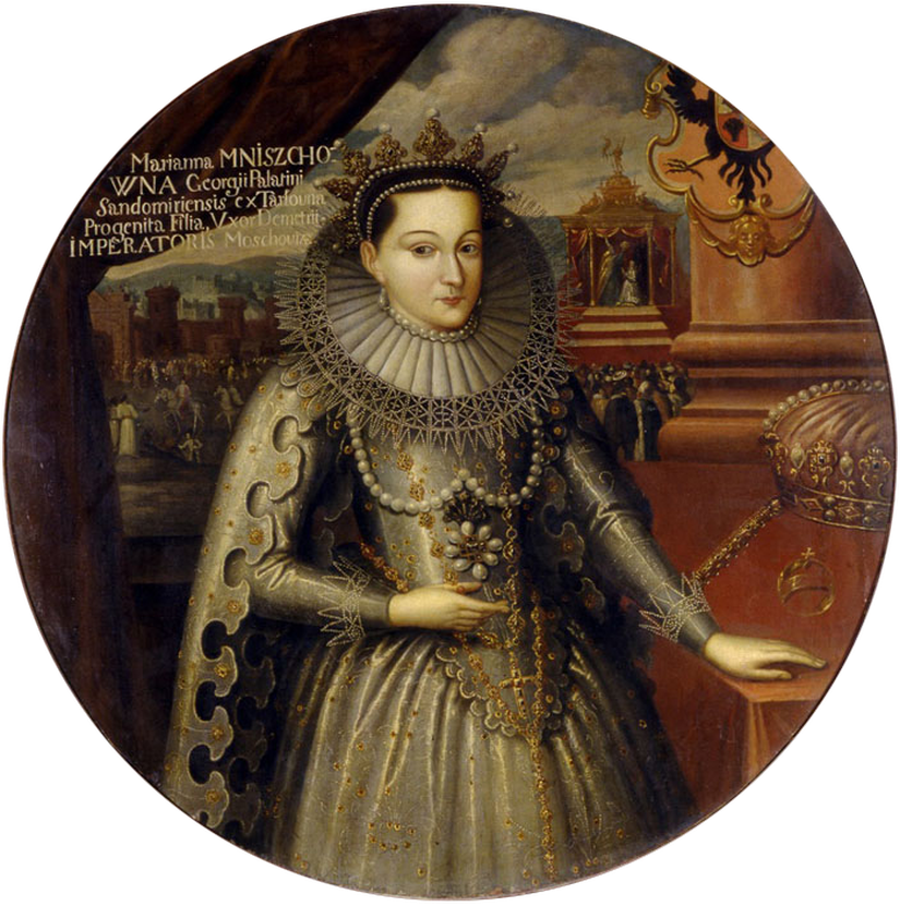 В конце шестнадцатого века вымерла династия московских правителей. На трон сел Борис Годунов. Его права на престол были слабыми, а молва обвиняла его в убийстве законного наследника. Шатким положением верховной власти воспользовались авантюристы, которые заручились поддержкой иностранных государств. Марина Мнишек стала движущей фигурой смуты. Она пережила многих участников смуты, включая двух мужей и сына. Марины Мнишек до авантюры Будущая российская царица родилась в знатной семье Сандомирского воеводы. Девушка получила строгое воспитание в католической вере, с детства она была окружена монахинями. По представлениям того времени Марина не отличалась красотой. Она была маленького роста, худая, черты лица были резкими. Изъяны во внешности компенсировались обаянием, умом и смелостью. Помолвка с Лжедмитрием В 1604 году в имении Мнишеков появился человек, выдающий себя за убитого царевича Дмитрия Иоанновича. Самозванец был некрасив, однако его поведение говорило о хорошем воспи