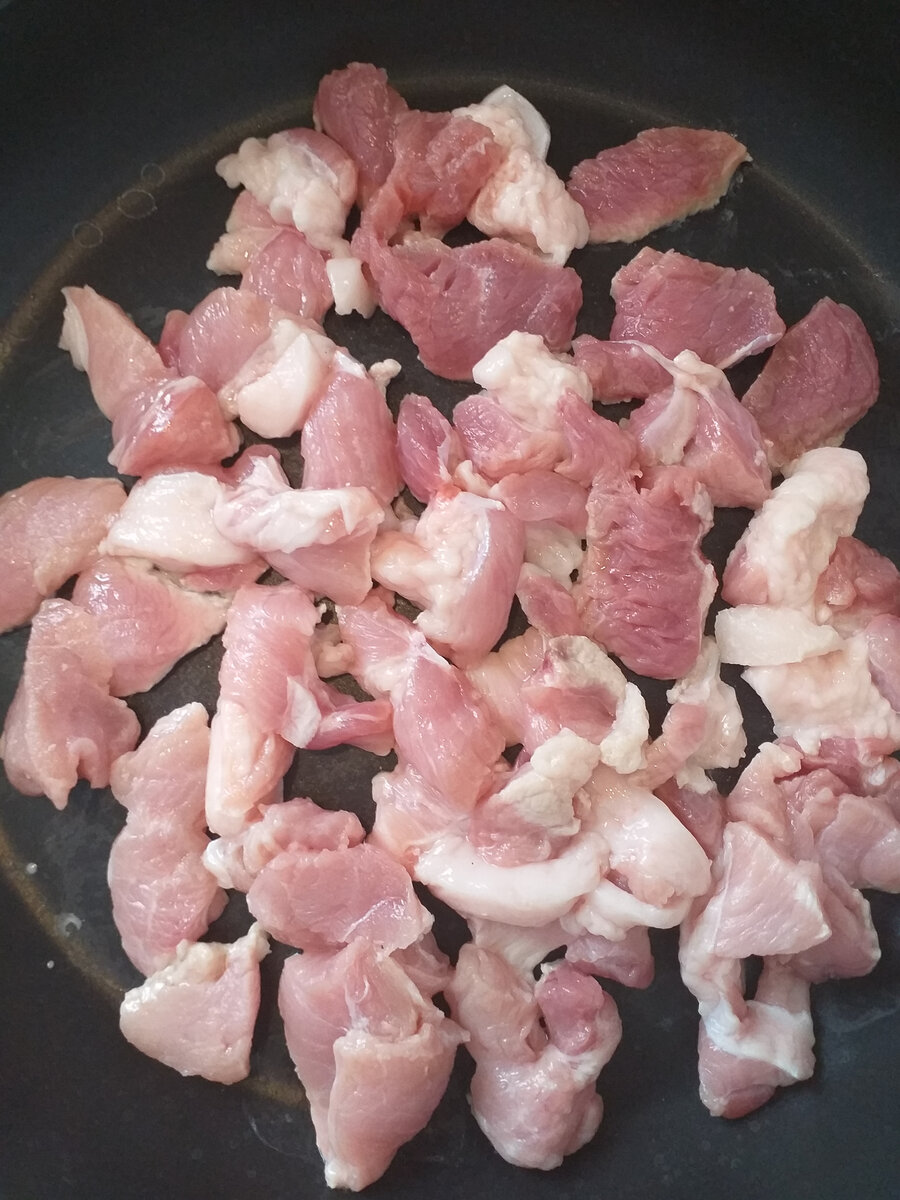 Промыть и нарезать свининку небольшими кусочками. Уложить её в разогретую сковороду, политую половиной указанного количества масла. Поперчить мясо и поставить тушить на средний огонь, накрыв посуду крышкой. Шаг 2.
