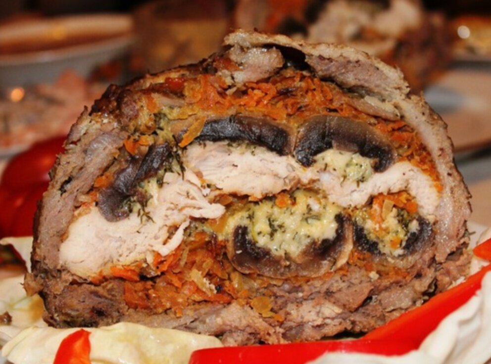 Этот рецепт необычного блюда из мяса отлично подойдет для праздничного стола и порадует ваших гостей, так как обделить вниманием это блюдо просто невозможно.