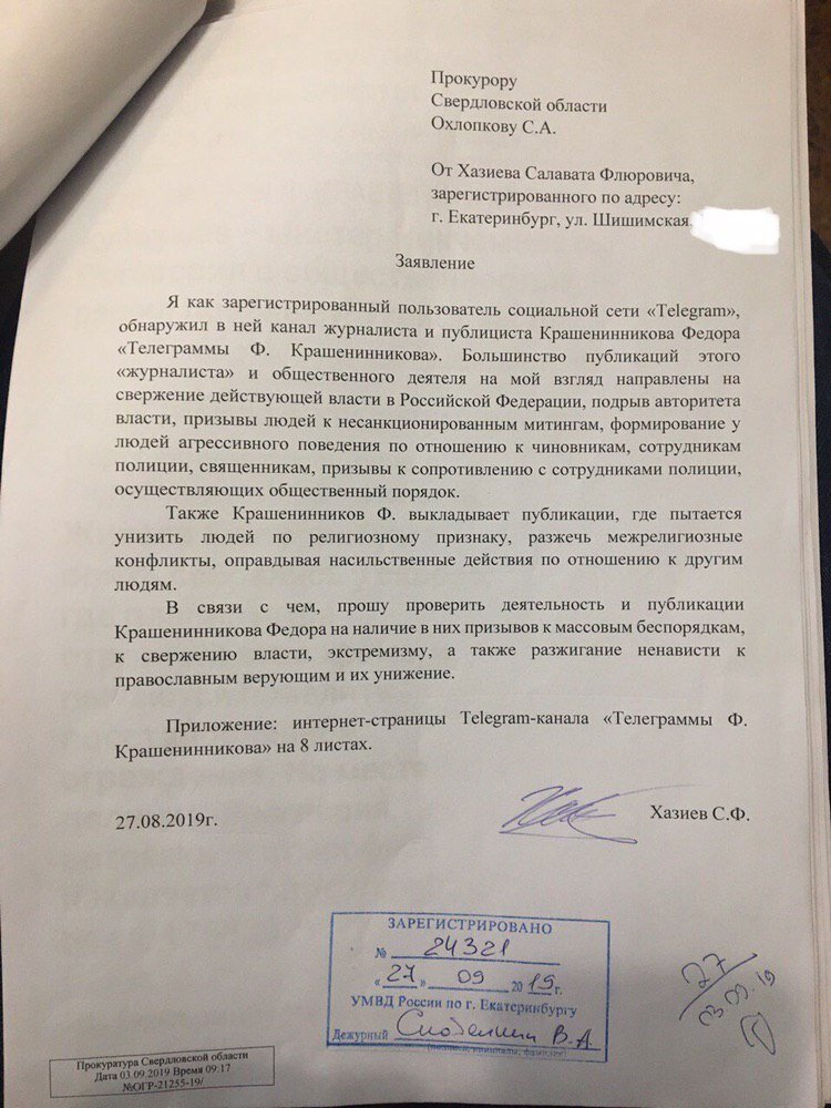 Донос Салавата Флюровича Хазиева 27 августа 2019 года в приемную прокурора Свердловской области С.А.Охлопкова пришел директор автосервиса «Апельсин» Салават Флюрович Хазиев и принес туда свое творчество - донос на меня, публициста и журналиста Федора Крашенинникова, текст которого можно увидеть на фотографии. На что, кроме специфического русского языка выпускника уральского филиала РАНХиГС (между прочим!) стоит обратить внимание? 1) Ставший поводом для возбужденного против меня административного дела эпизод про судей ( https://www.kommersant.ru/doc/4141389) в доносе вообще не фигурирует. После двух месяцев рассмотрения принесенных Салаватом Флюровичем 8 листов распечаток эксперты ФСБ и полиции смогли превратить в административное дело только это. То есть, как я и говорил, вовсе не в судьях дело, а в желании найти повод. 2) Салават Флюрович Хазиев не просто подписал что-то и отправил по почте, он оторвался от управления своими шиномонтажками и лично явился в приемную прокурора области