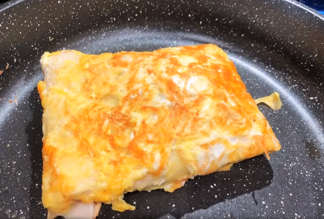 Для такого чудесного завтрака, нам понадобятся: 1 лаваш, тортилья 1 яйцо 25 г любого твердого сыра 1-2 г топленого масло или сливочное 2-3 слайса ветчины ( мясо, колбаса) Для начала, нужно подготовить сковороду. Берем маленький кусочек топленого или сливочного масла, кладем в сковороду и ждем, пока сковорода нагреется, после чего сковороду хорошо промазываем растопленным маслом. Далее берем тарелку, наливаем в нее немного воды и промакиваем в ней лаваш, главное, чтобы лаваш хорошо пропитался в воде, после чего кладем его на сковороду и делаем огонь чуть меньше среднего. Отправляем туда яйцо, слегка перемешиваем и распределяем по всей поверхности лаваша. Сверху немного посыпаем натёртым сыром. Количество сыра делаем по вкусу. Готовим до тех пор, пока яйцо не начнет схватываться, а сыр плавиться, сам лаваш должен слегка поджариться. После чего переворачиваем лаваш.В центр добавляем немного сыра и ветчину. Сверху ветчины можно добавить еще немного сыра, после чего заворачиваем,