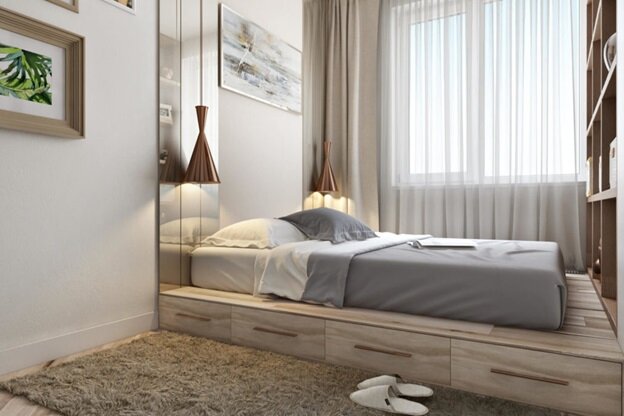 Если квартира на столько мала, что нет места даже для кровати, не стоит отчаиваться, существует несколько вариантов решения проблемы. 1. Кровать-подиум. У нее масса существенных преимуществ. Воспользовавшись этим дизайнерским решением, можно кардинальным образом изменить внешний вид квартиры. Если в такую кровать встроить ящики и полки, то получится объединить место для сна и для хранения вещей. Кроме того, при необходимости модель скроет трубы, провода, розетки. Чтобы в подиуме поместилось как можно больше различных систем хранения, нужно выбирать высокую кровать. Но главное здесь не переборщить, чтобы спальное место не превратилось в чердак. 2. Кровать-шкаф. Для обладателей малометражных квартир отличным решением обстановки послужит мебель, которая может трансформироваться. При оформлении спального места стоит обратить внимание на кровать-шкаф, она занимает совсем мало места и удобна в эксплуатации. В течение дня в комнате весьма просторно из-за отсутствия громоздкой кровати, а вече