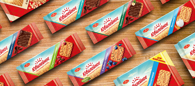 Brief Yubileynoye was created in honor of the 300th anniversary of the Romanov Dynasty in 1913. It remains to be the favorite delicacy of most Russians for a century: Today, every 5th packet of biscuits sold in Russia is Yubileinoye. The flour confectionery market began to grow in 2010, and in 2015 the situation on the market was favorable which attracted new remarkable brands. The conservative and reserved packaging of Yubileinoye needed to be changed due to this increase in competition. Our challenge was to redesign the packaging: to develop a powerful brand block and to offer a system for subranges. Solution The design solution was built on preserving and strengthening brand awareness and traditions. A pattern consisting of two coloured isosceles triangles had been placed on Yubileinoye packaging since 1967. We decided to continue with this traditional identity. The enlarged triangle became the central element of the pack. A placement system for subranges and tastes was created wi