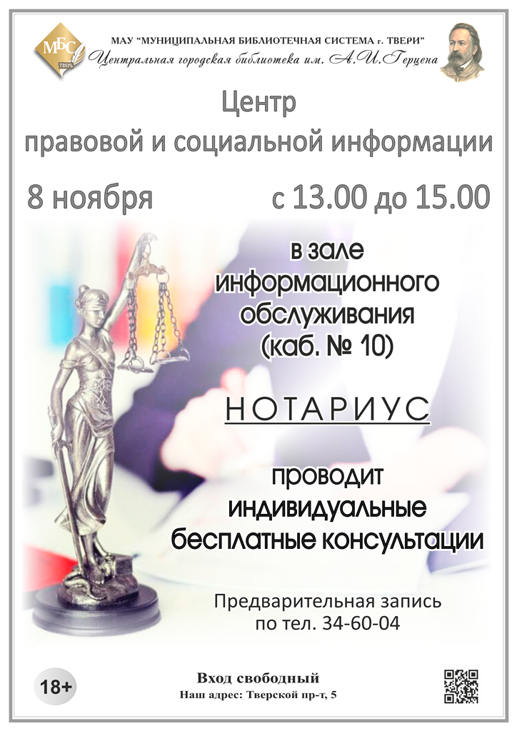 Центр правовой и социальной информации Центральной городской библиотеки им. А.И. Герцена приглашает желающих на бесплатные индивидуальные консультации нотариуса, которые состоятся 8 ноября с 13.00 до 15.00 в Зале информационного обслуживания читателей.