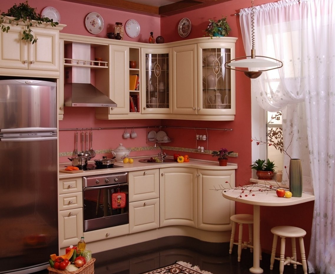 Малогабаритная кухня создает определенные сложности в ремонте. Однако дизайнеры знают немало приемов, позволяющих рационально использовать каждый сантиметр площади. Поговорим об удачных примерах ремонта, особенностях отделки, монтаже освещения и дверей в маленькой кухне. Стены Обычно дизайнеры рекомендуют использовать в небольшом помещении белый цвет, чтобы визуально расширить пространство. Но для кухни это может стать не лучшим решением: светлые обои будут быстро пачкаться. Прекрасная идея – комбинировать однотонные обои с принтованными. К примеру, оригинально смотрятся обои с красивой графикой, интересными слоганами. В качестве материала для кухонного фартука подойдут: Лучше выбирать максимально светлые оттенки и практичные, легко поддающиеся уборке, материалы. Пол Напольное покрытие должно быть нескользким, легко отмываться и выдерживать постоянные механические нагрузки. Геометрические рисунки помогут сделать помещение более просторным. Ламинат светлы