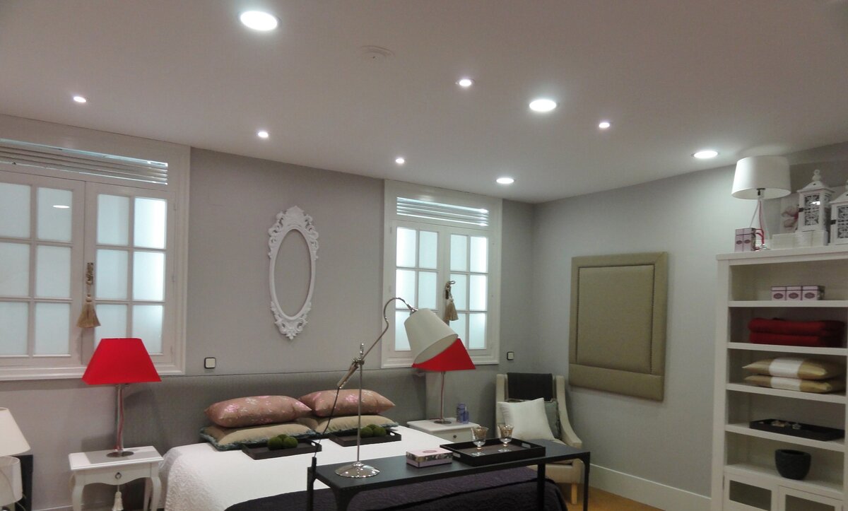 Натяжные потолки в квартире или частном доме стали простым и удобным решением, позволяющим визуально изменить объём помещения, и сделать упор на деталях интерьера. Помимо эстетической составляющей, главным преимуществом этих конструкций является возможность изменить стандартную схему освещения. Правильный подбор точечных светильников для натяжного потолка полностью изменит интерьер, и придаст ему некую изюминку. Как выбрать точечные светильники Зачастую тип крепления светильников учитывают ещё при раскрое натяжного потолка. Кроме обычной подвесной люстры, есть спот-системы, а также скрытая подсветка, состоящая из световых шнуров или так называемого «второго света». Накладные модели выступают над поверхностью, поэтому занимают минимум потолочного пространства, а встроенные — находятся между покрытием и базовой поверхностью, при этом декоративные элементы и лампы немного «выглядывают» из отверстий. Чтобы не испортить покрытие, для точечного освещения есть свои ограничения.