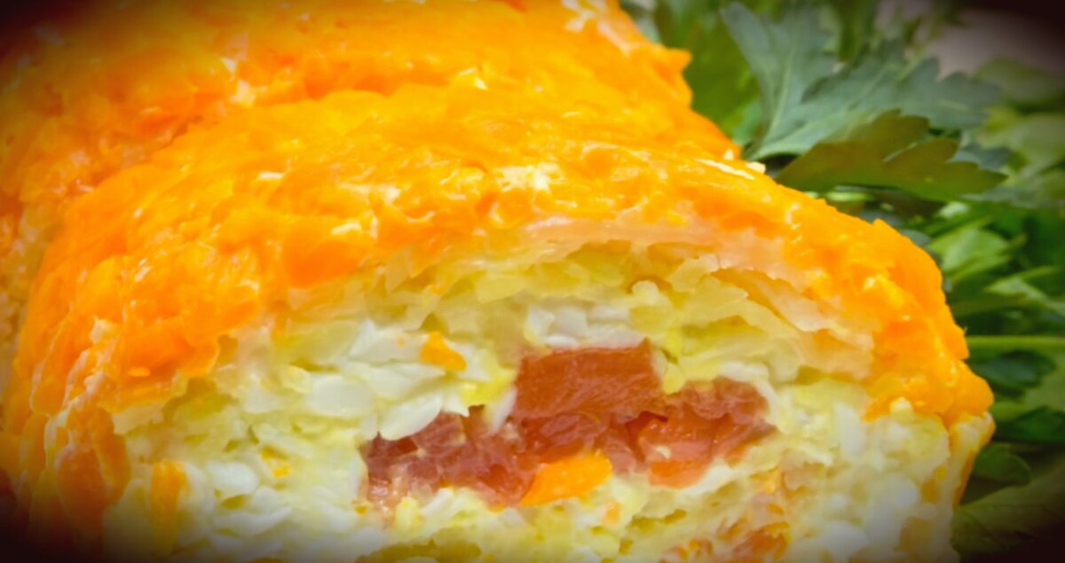 Восхитительный красочный салат закуска "Царский Рулет". Этот салат прекрасно украсит ваш стол. ИНГРЕДИЕНТЫ: 3 шт. отварной картофель. 2 шт. отварная морковь. 3 шт. отварные яйца. Красная слабосоленая подкопчённая рыбка. Майонез. Соль по вкусу. Натрем отваренный картофель и морковь в крупную терку. Яйца также мы натрем в крупную терку. Красную рыбу нарежем тонкими дольками. Разложим пергаментную бумагу и будем все поочередно выкладывать слоями, промазывая каждый слой майонезом. Первым слоем выложим тертую отварную морковку, смазав ее майонезом. Сверху вторым слоем выкладываем протертый в терку картофель, посолим по вкусу и смажем майонезом. Далее, третьим слоем выложим яйцом, смазав майонезом. Уложим ломтики нарезанной красной рыбы и свернем все в рулет, отправив его на 25 минут в холодильник. Выложим наш рулет на разделочную доску, нарежем на дольки и выложим их на тарелку, можете украсить зеленью и подавать на стол.