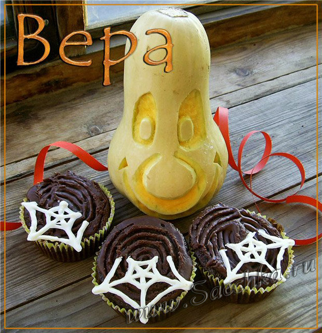 Шоколадные кексы приготовлены из «шоколада на кипятке», украшены помадкой и «паутиной» из белого шоколада.