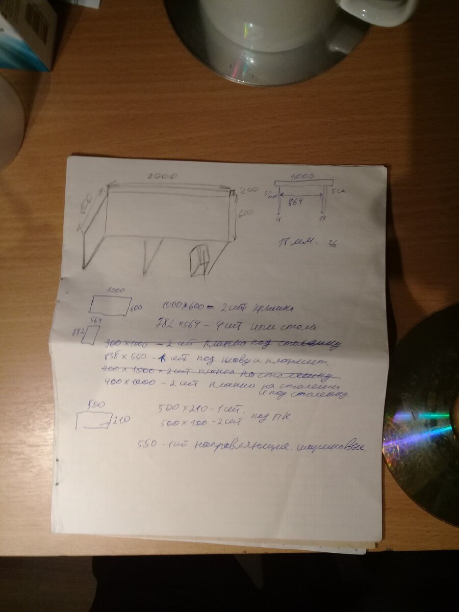 Все начинается с точного плана дизайна. Который дорабатывается в плане эффективности и более рационального расположения на будущее. Вместо одной столешки на 2 метра и шириной 60 см. Было предложено сделать 2 стола по 1 метру. И в одном есть выкатная столешка, а в другом нет. Вспоминаем для расчета столешки что направляющие это минус 26 мм. от боковых стенок. Были использованы полновыкатные направляющие на 550 мм. за 201 рубль. Также 12 подпятников за 8 рублей. Подпятники на столы и подставку для ПК. Заказал распил фанеры. Фанера ФК 18мм толщиной. Ушло 2 листа по цене вышло 3500 рублей. И распил 760 рублей. Итого вышло 4469 рубля. Собрано все на пластиковые уголки и 16 саморезы. Уголки оставались с предыдущих работ, как и саморезы. Уголки в последний раз покупал за 123 рубля упаковка из 100 штук. саморезы штук 200 за 180 рублей. еще в 2016 году. пока еще есть. Да и в строительном магазине саморезы не так дорого. Далее в работу идет шлиф машинка. Шутка. Берем то что отдали с