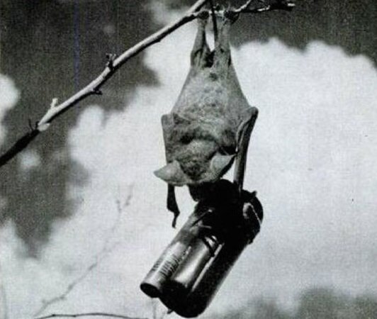 В войнах человечество всегда использовало животных. В течение многих столетий в битвах участвовали лошади, верблюды, гепарды, боевые слоны. Со временем у людей возникли новые идеи применения зверей для нанесения урона противнику. Во время Второй Мировой войны для участия в боях привлекали даже мелких животных. Летучие мыши с бомбами Во время войны с Японией американцы решили использовать летучих мышей для бомбардировки противника. Их подвергали воздействию низких температур, а когда мыши впадали в спячку, к ним прикрепляли зажигательные бомбы. Не обошлось без накладок: как-то во время испытаний несколько животных с прикрепленными нарядами неожиданно проснулось и спряталось на базе. Произошел взрыв, и здание сгорело. Проект не был осуществлен, так как американцы нашли более эффективное средство для бомбардировки Японии. Собаки-взрывники Идея использования животных для подрыва противников приходила в голову не только американцам. Во время Второй мировой войны в Советской Армии исп