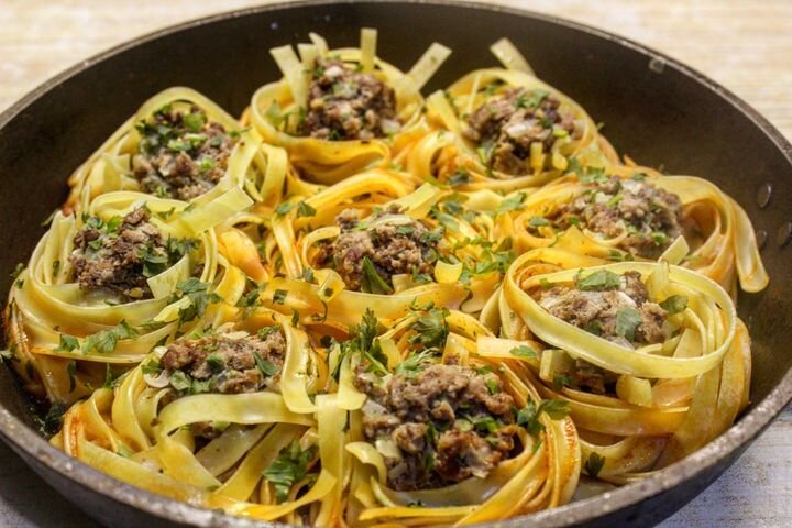 Вкусный и быстрый ужин для всей семьи. Ставьте лайк и подписывайтесь на канал «Fresh Recipes» в Яндекс Дзене, чтобы не пропускать наши новые публикации. А также присоединяйтесь к нам на нашем сайте fresh.ru, в соцсетях Фейсбук, Инстаграм и Youtube, где вы узнаете еще больше новых рецептов, кухонных лайфхаков, полезных советов и самых интересных новостей из мира еды Порций: 6 Время приготовления: 35м. (10 минут на подготовку и 25 минут на готовку) Ингредиенты (6 порций) Приготовление 1) Лук мелко нарезать. 2) Добавить лук к фаршу. 3) Посолить, поперчить и перемешать. 4) Сковороду немного смазать маслом и выложить гнезда. 5) Сверху на гнезда выложить фарш. 6) В чаше смешать томатную пасту и растительное масло. 7) Добавить соль, сахар, перец и сушеные травы. 8) Добавить томатный сок. 9) Влить заправку в сковороду, готовить под крышкой 25 минут на среднем огне. 10) Подавать к столу горячими. Приятного аппетита! Смотрите также Спагетти с соусом Болоньезе Шакшука Сочные гречневые котлетки бе