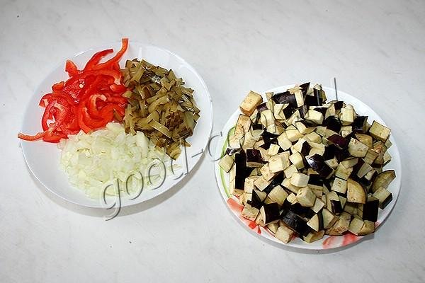Баклажаны нарезать небольшими кубиками, перец - соломкой, лук - мелкими кубиками, солёные огурцы - небольшими брусочками. В сковороде на большом огне разогреть 2 столовые ложки растительного масла (~35 граммов) и выложить лук и болгарский перец. Обжаривать при частом помешивании до начала зарумянивания лука - примерно 7 минут. Выложить овощи в