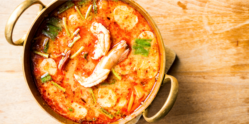 Как приготовить Тайский суп Том Ям Практически все национальные блюда Тайланда готовятся на основе перца Чили и кисло-сладких соусов. Подобные «миксы» не оставляют равнодушным даже самого привередливого гурмана. Ведь главное правило глубокого, яркого вкуса блюда – это сочетание кислоты, сладости и остроты. Ингредиенты: Суп состоит из – остро-сладкий куриный бульон, перец чили, листья калифорнийского лайма, имбирь и колган. В названии блюда Тайланда есть 2 составляющие: «том» - варить и «ям» - острый салат. Базовое название дополняют, если хотят указать состав супа, вернее, с каким ингредиентом сделана еда. Приготовление: