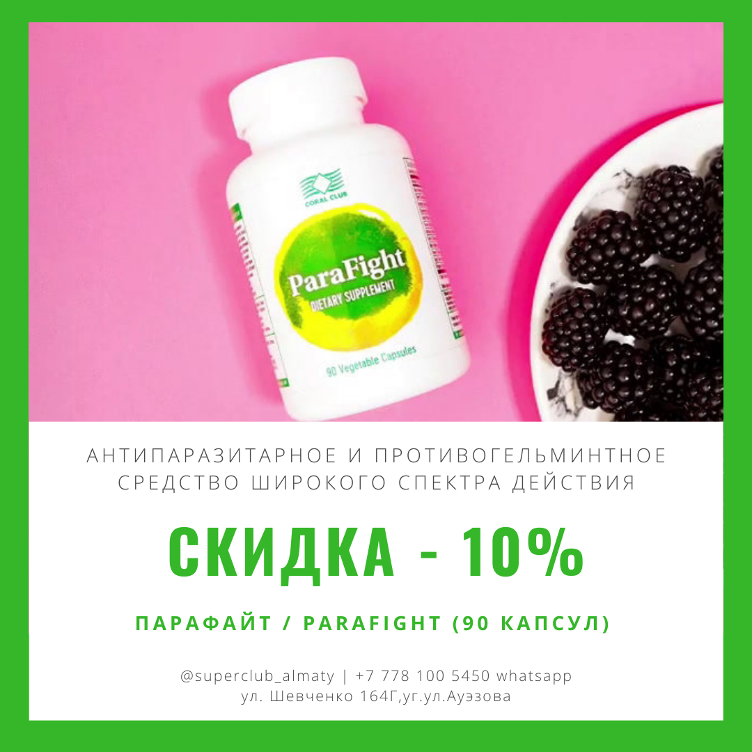 только 2 дня, до 1 ноября скидка -10% ПараФайт / ParaFight - антипаразитарное и противогельминтное средство широкого спектра действия. Благоприятно влияет и стабилизирует работу желудочно-кишечного тракта (ЖКТ). Содержит только натуральные составляющие. Действие Парафайт на организм: 👍🏻противопаразитарное действие; 👍🏻эффективно действует при лямблиозе, аскаридозе, энтеробиозе и других различных гельминтозах; 👍🏻защищает слизистые оболочки от повреждения и инфицирования паразитами; 👍🏻направлен на детоксикацию организма. ⠀ • 😱ОСТЕРЕГАЙТЕСЬ ПОДДЕЛОК😱 ⠀ ❗Наличие продуктов и актуальную стоимость уточняйте в whatsapp htts://wa.me/77781005450 ❗ ⠀ 😱ОСТЕРЕГАЙТЕСЬ ПОДДЕЛОК😱 ⠀ ... 🌈 Чтобы #САМОСТОЯТЕЛЬНОприобретать продукты с 20% скидкой, пройдите по ссылке https://goo.gl/z4cQIg зарегистрируйтесь и получите доступ ко всем 285-ти товарам⤴ ⠀ ⏺Где покупать в Алматы продукты Coral Club по минимальным ценам, и получить подарки по акции? ⠀ В офисе-продаж на ул.Шевченко
