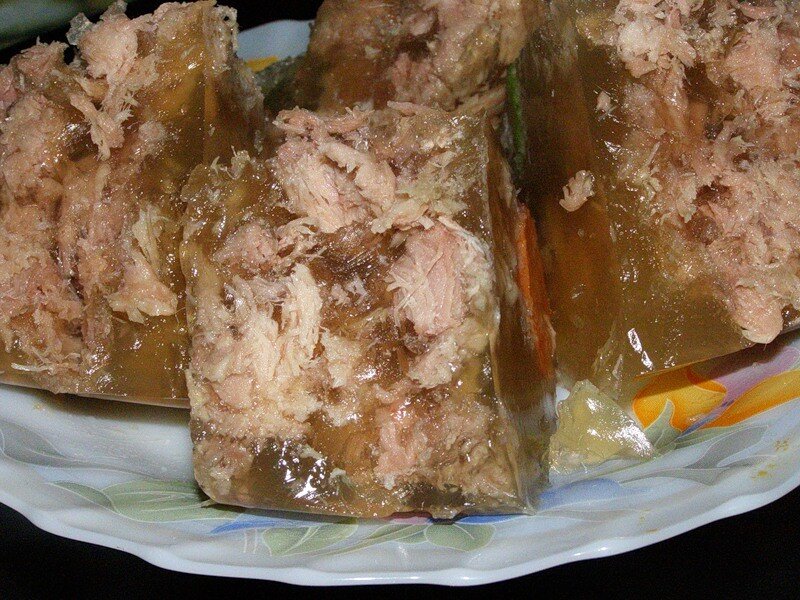 А вы знали, что холодец можно готовить впрок на зиму, закатав его в банках? Получается ничуть не хуже, чем только что приготовленный. Хочу поделиться своим рецептом, надеюсь вам он понравится. Приготовление: Сначала хочу сказать по поводу мяса: для холодца можете использовать любое, какое у вас есть и какое любите. Наша семья любит холодец из свинины, поэтому я описываю рецепт с этим видом мяса. Итак, понадобится 4 свиные ножки. Предпочитаю использовать именно их, так как с ними холодец хорошо застывает, и никакой желатин не понадобится. Заливаем ножки водой и варим на медленном огне на протяжении 6 часов. За час до готовности солим по вкусу, добавляем одну морковь, 2 лавровых листа, две луковицы целиком и 7-8 горошин перца. Затем убираем овощи и специи, вытаскиваем мясо, а бульон процеживаем. Мясо отделяем от костей и режем небольшими кусочками. Кладем мясо в стерилизованные банки и заливаем горячим бульоном. Закатываем, укутываем одеялом или шубой и оставляем так до полного остывани