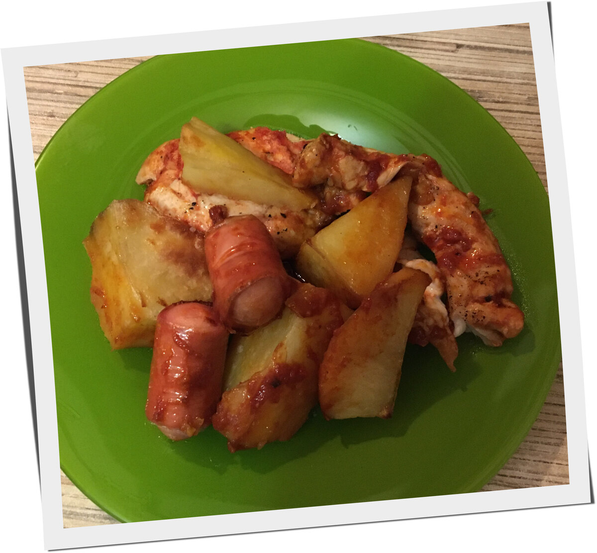 Прошлый рецепт с курицей был явно не из рубрики здоровое питание, так как это были куриные бедра и ножки запеченные в майонезе (ссылка на него на всякий случай в конце статьи). Но сегодня хочется немного копченого, но бюджетно и в рамках приличия, поэтому сделаем куриную грудку в томатом соусе с копчеными сосисками. Для приготовления блюда, мне понадобится: - половина куриной грудки - 4 средних картофелины - 2 копченых сосиски - подсолнечное масло - 2 чайных ложки томатной пасты (разведенные в 100 граммах воды) - 2 зуба чеснока - соль, перец, сахар Картошку режем дольками примерно одинакового размера, кладем на противень, смазанный растительным маслом, и отправляем в разогретую до 180 градусов духовку на 20 минут. Куриную грудку режем пополам вдоль, чтобы получить 2 филе. Делаем поперечные надрезы (как у советского батона), посыпаем слегка солью, перцем и оставляем минут на 10. Делаем томатный соус. В пиалу кладем 2 чайных ложки томатной пасты, и растворяем их в 100 граммах воды. Да
