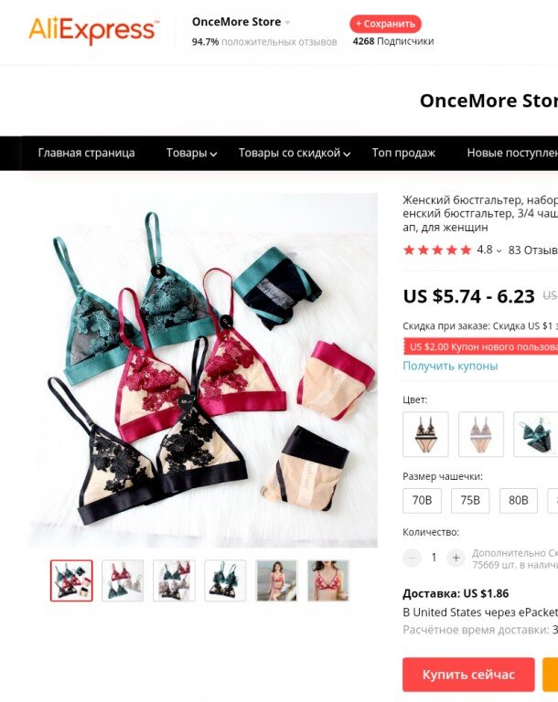 На АliExpress огромный выбор нижнего белья, начиная от модели, заканчивая стоимость. Зачастую одну и туже модель можно найти в разных ценовых категориях: 1 доллар, 100 долларов. Как правильно выбрать интересующую вас модель, читайте в предыдущей статье. 1. Комплект с треугольным бюстгальтером и трусиками танга Комплект сделан из шёлка с элементами кружева. Лиф с мягкими треугольными чашками без косточек и поролона. Это прекрасный вариант для жарких дней и груди, которой не нужна поддержка. Купить. 2. Бархатный комплект Приятная ткань подчеркнёт вашу фигуру и не создаст ощущение дискомфорта. Бюстгальтер без косточек, у трусиков высокая осадка. Есть три цвета: винный, изумрудный и угольно-чёрный. Купить. 3. Комплект с бюстгальтером push-up и кружевными трусиками Этот бюстгальтер на косточках полностью закрывает грудь, но при этом не теряет своей соблазнительности. Бретели можно отстегнуть, поэтому его можно носить и ежедневно, и под вечернее платье с открытой спиной. Купить. 4. Комплект
