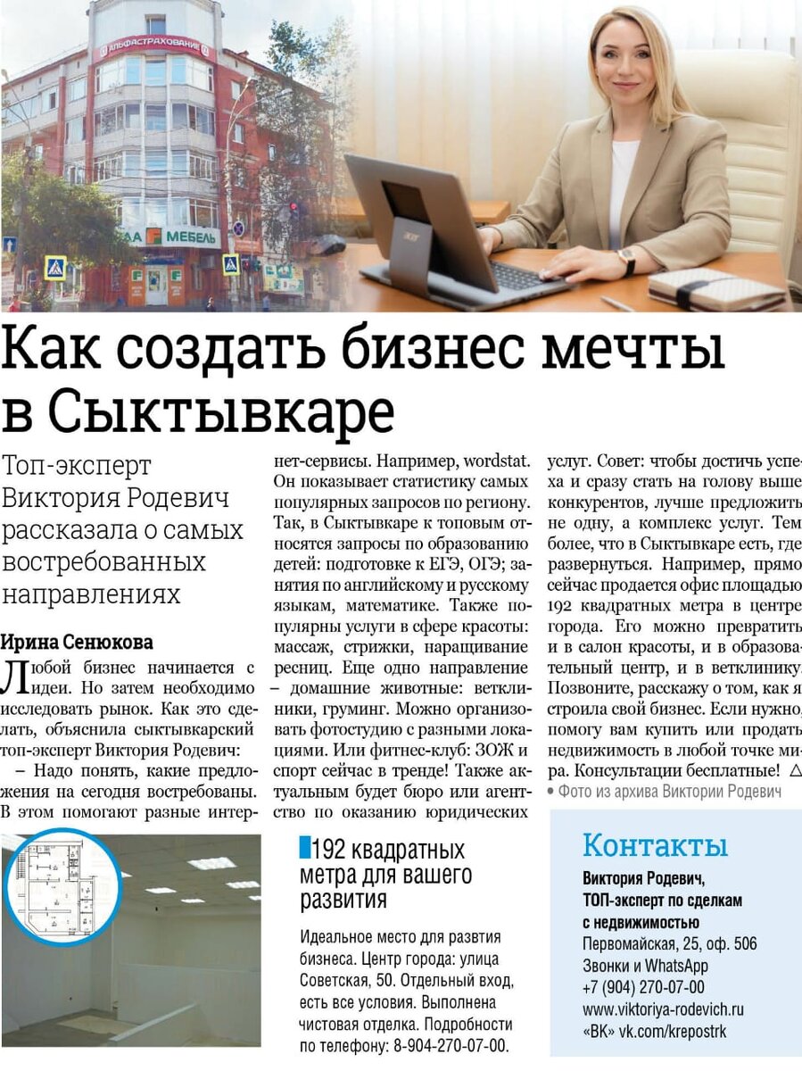 – Надо понять, какие предложения сегодня востребованы. В этом помогут разные интернет-сервисы. Например Wordstat: он показывает статистику самых популярных запросов по региону. В Сыктывкаре к топовым относятся запросы по обучению детей: подготовке к ЕГЭ, ОГЭ; занятия по английскому и русскому языкам, математике. Популярны услуги в сфере красоты: массаж, стрижки, наращивание ресниц. Еще одно направление – домашние животные: ветклиники, груминг. Можно организовать фотостудию с разными локациями. Или фитнес-клуб: ЗОЖ и спорт сейчас в тренде! Актуальным будет и бюро или агентство по оказанию юридических услуг. Совет: чтобы достичь успеха и стать на голову выше конкурентов, лучше предлагать не одну, а комплекс услуг. Тем более что в Сыктывкаре есть где развернуться. Например,