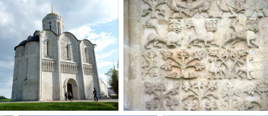 Дмитриевский собор во Владимире был построен в 1194-1197 годах как придворная церковь Всеволода «Большое Гнездо» (оцените прозвища), крещёного Дмитрием, в честь святого великомученика Дмитрия Солунского. Центральное положение на каждом из трёх фасадов храма занимает фигура царя Давида. (Тот же Давид, кстати, изображён и на стене церкви Покрова на Нерли.) Есть тут целая «галерея» святых, включая князей Бориса и Глеба. Есть рельеф «Бой Геракла со зверем», и другие «древнегреческие» сюжеты. Немало фигурок фантастических зверей и птиц: львы с «цветущими» хвостами, гуси со сплетёнными шеями. Заметим, что животные с переплетёнными шеями характерны никак не для Европы, а скорее для рельефов Египта и Месопотамии.
