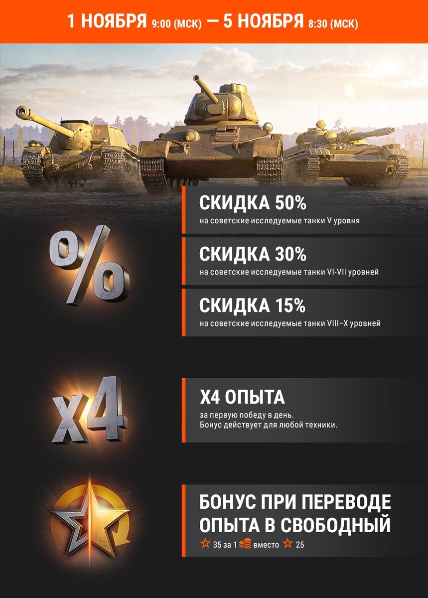 • Скидка 50% на советские исследуемые танки 5 уровня.