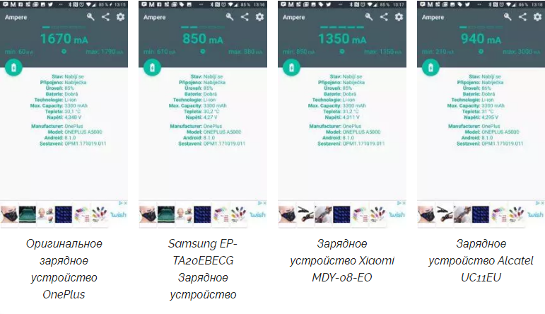 - С оригинальным зарядным устройством с поддержкой Dash Charge мы достигли значений около 1700 мА.