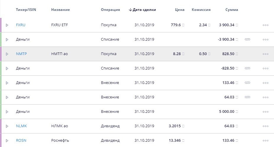 Всем добрый вечер! Сегодня, после очередного еженедельного пополнения портфеля на 5 000 рублей, я покупал оставшиеся 100 акций Новороссийского морского торгового порта (НМТП, NMTP) по цене 8,280 за акцию, то есть, немного дешевле, чем на прошлой неделе. Тогда на эту покупку немного не хватило денег. Также сегодня были куплены по цене 779,60 руб. ещё 5 паёв (акций) финексовского ETF-фонда FXRU, базовым активом которого являются еврооблигации ряда крупнейших российских компаний. Если говорить о всех движениях по счёту, то также сегодня поступили дивиденды от Роснефти (ROSN) и НЛМК (NLMK) общей суммой около 200 рублей. Общая активность сегодня по портфелю выглядит так: И структура портфеля уже очень близка к запланированной (акции 60%, облигации 30%, еврооблигации 10%), а покупки на следующей неделе окончательно эту структуру сформируют. Вот диаграмма портфеля по активам: А вот и результат портфеля на сегодня. В течение дня выходили в плюс, но потом коррекция рынка опять отбросил портфель