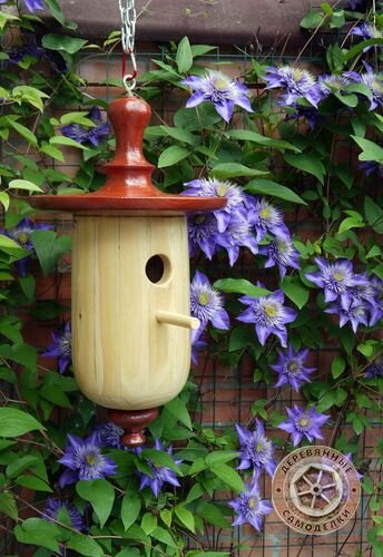Мой синичник имеет слегка коническую форму с круглой крышей в виде широкополой шляпы. Такой вариант более трудоемкий, чем обычный прямоугольный, но более интересен в изготовлении и на внешний вид.