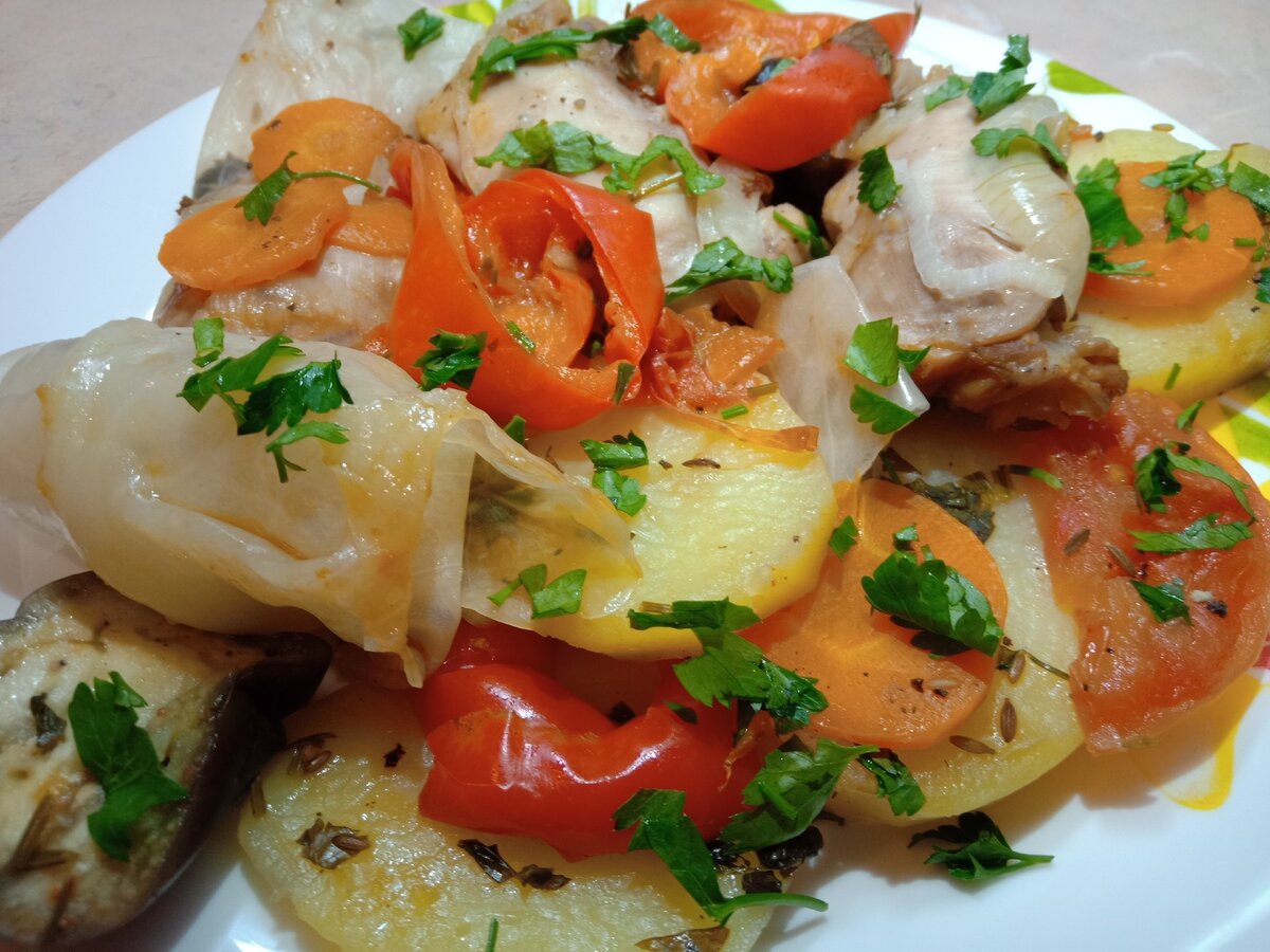 Домляма - восточное блюдо, необыкновенно вкусное, сочное и очень простое в приготовлении. Готовится домляма настолько быстро, что даже сама удивляюсь с каждым разом. Выглядит всегда празднично и аппетитно. Ароматы во время приготовления неописуемые. Для приготовления понадобится: В глубокую сковородку с толстым дном уложить куриные бёдра без кожи (мясо можно выбрать любое) Посолить и поперчить. Сверху разложить одну большую луковицу нарезанную полукольцами. Морковь нарезать кружочками. Каждый слой чуть-чуть солю. Масло лить не надо, так как овощи пустят сок. Следующий слой помидоры (один большой), так же нарезать и разложить. Баклажан кружочками и болгарский перец. Незабываем присолить. Картофель нарезать и уложить, сверху посолить, поперчить и присыпать щепоткой зиры (кумин) Мелко нашинковать зелень - в идеале кинза, петрушка. Все овощи прикрыть капустными листами. Воду добавлять не надо. Включить сначала максимальный огонь, а через 20 минут готовить на среднем, пока картошка не ста